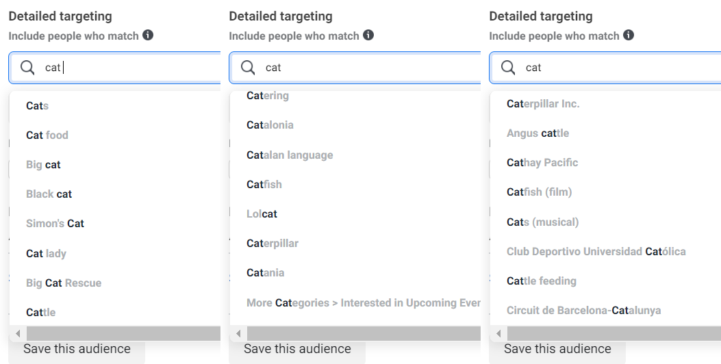 Facebook Ads Manager showcasing the interest results for "cat"